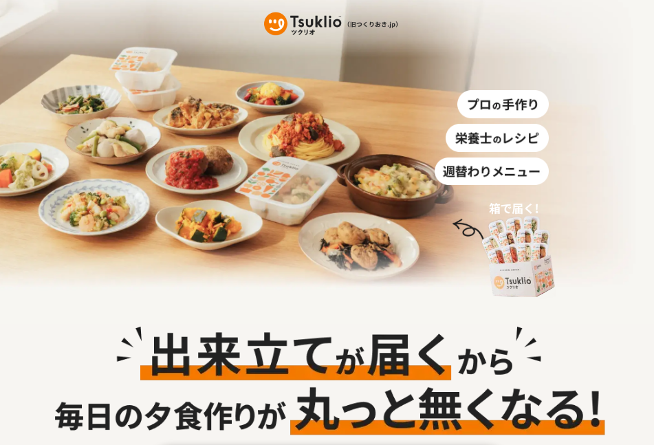 Tsuklio(ツクリオ)(旧:つくりおき.jp)は、「忙しくても家族にはちゃんとしたご飯を食べさせたい」という方に最適なサービスです。冷蔵ならではの美味しさと家庭的な味わいは、他の宅食サービスと一線を画しています。迷ったらまず選びたい安心と手軽さの宅食サービスです。